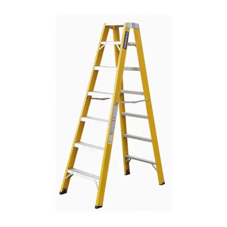A Escada modelo Tesoura TF-6A Amarela da Cogumelo permite acesso a ambos os lados da escada;