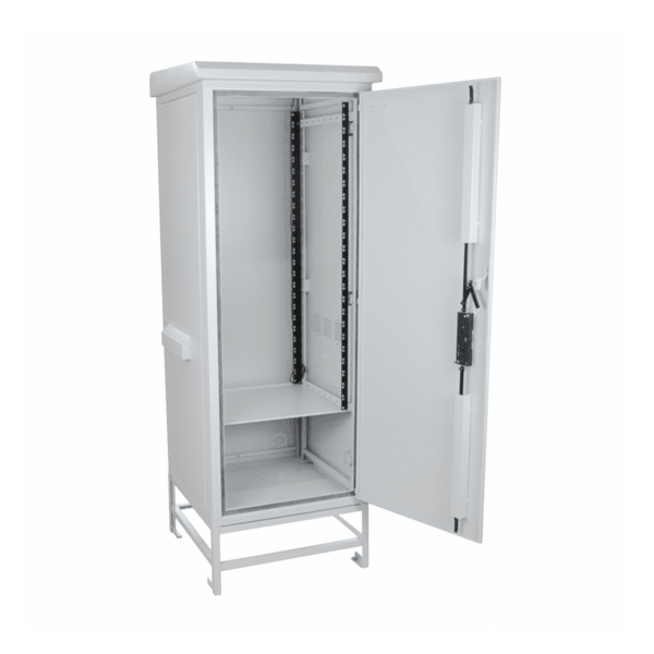 Shelter de piso, padrão 19”, com portas frontal e traseira e plano de fixação ajustáveis (profundidade) em ambos os lados, o que facilita a instalação e conectorização de qualquer tipo de equipamento. O fechamento de ambas as portas é feito através de fechos de padrão industrial com chaves YALE, também sendo possível aplicar um cadeado ao corpo do fecho, redobrando sua segurança.